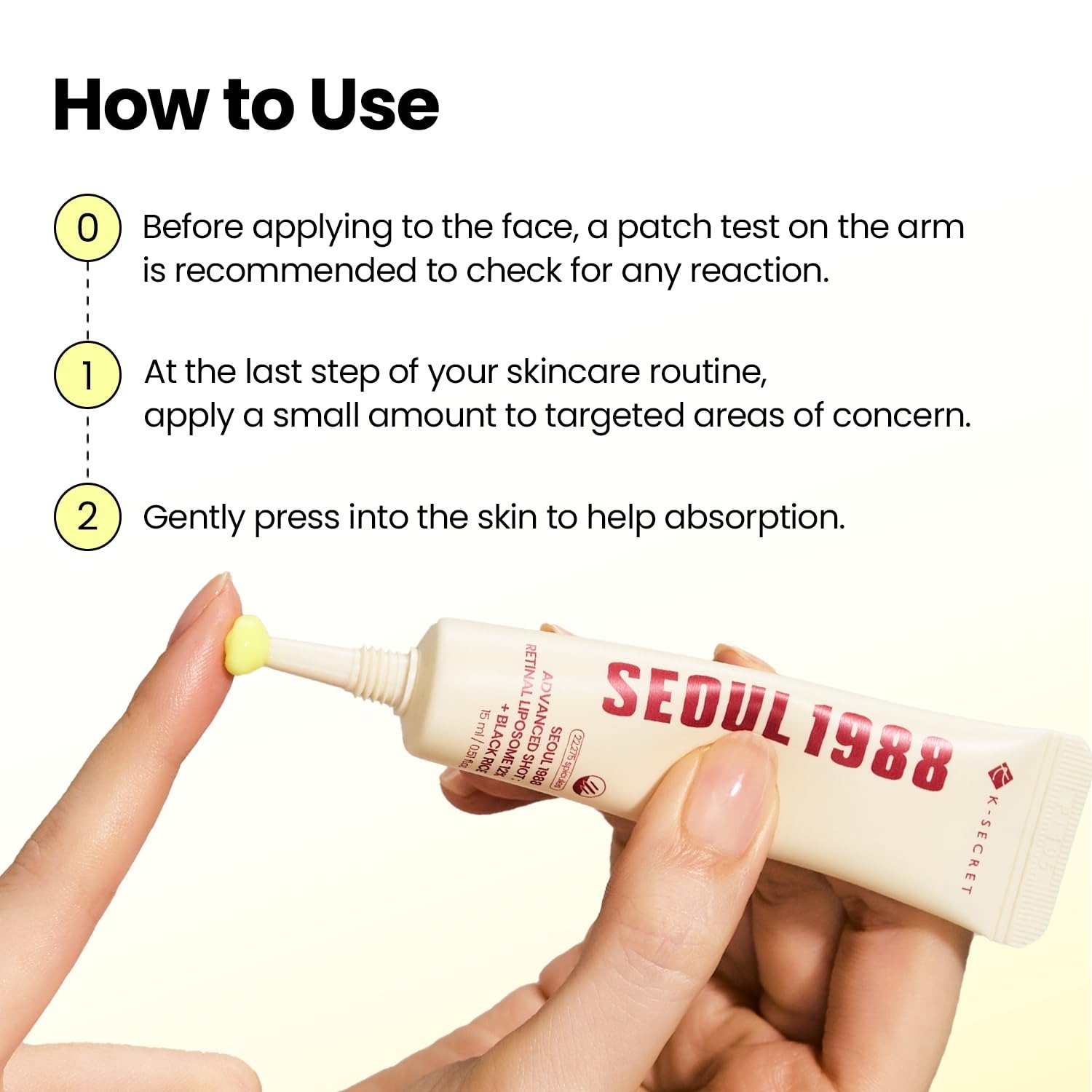 Seoul 1988 Advanced Shot: Retinal Liposome 12% + Black Rice is a high-performance treatment designed to target signs of aging, improve skin texture, and boost overall radiance. Powered by encapsulated retinal liposome technology, it delivers potent anti-aging benefits with enhanced stability and reduced irritation. Combined with black rice extract, this formula helps nourish, smooth, and strengthen the skin, revealing a clearer, firmer, and more youthful-looking complexion.