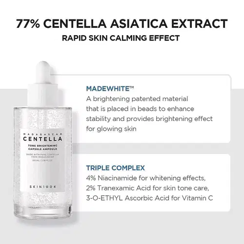 The combination of Centella Asiatica and brightening ingredients makes it suitable for sensitive, oily, combination, and acne-prone skin types.
