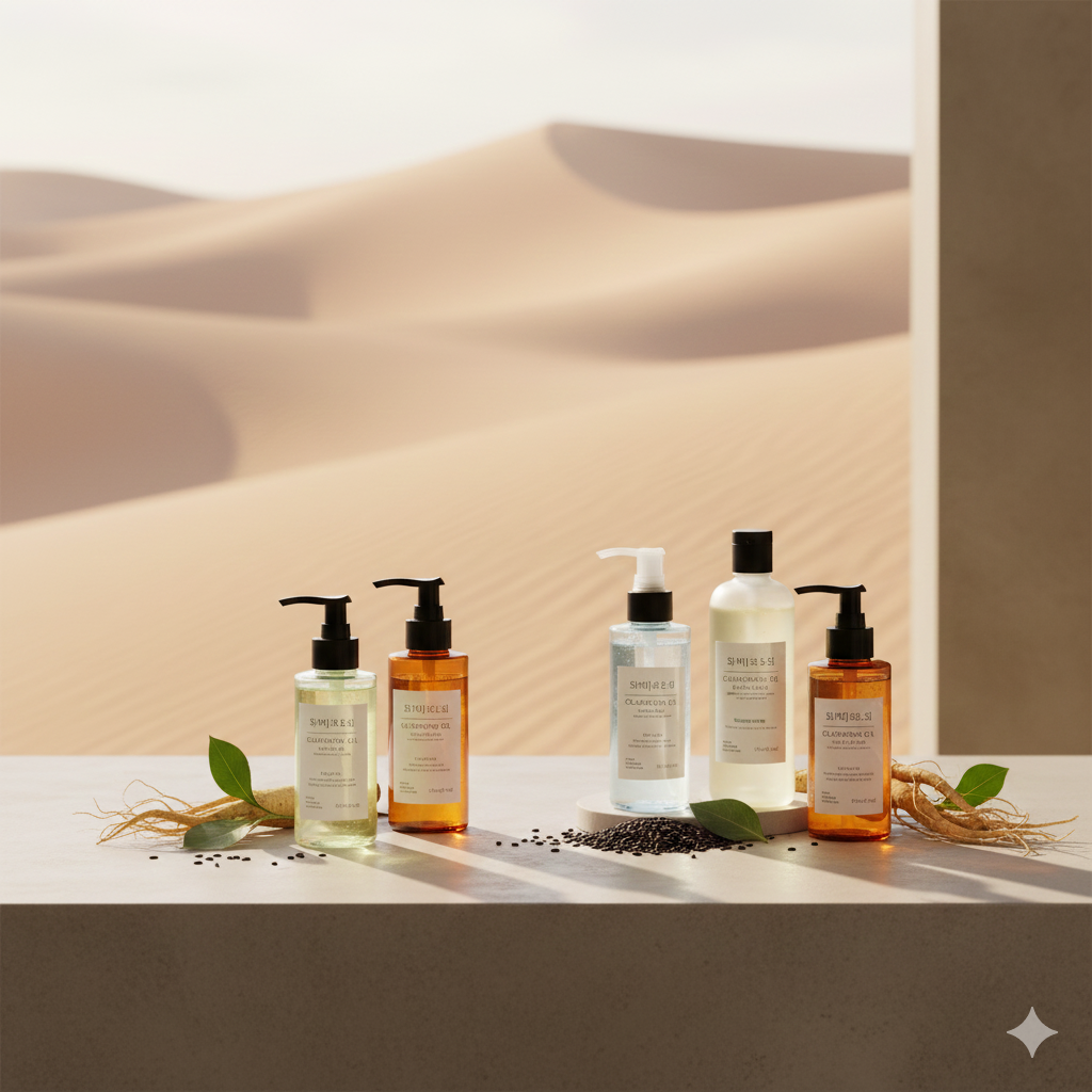Arrangement of Korean cleansing oils with a desert-inspired background representing Qatar’s climate.